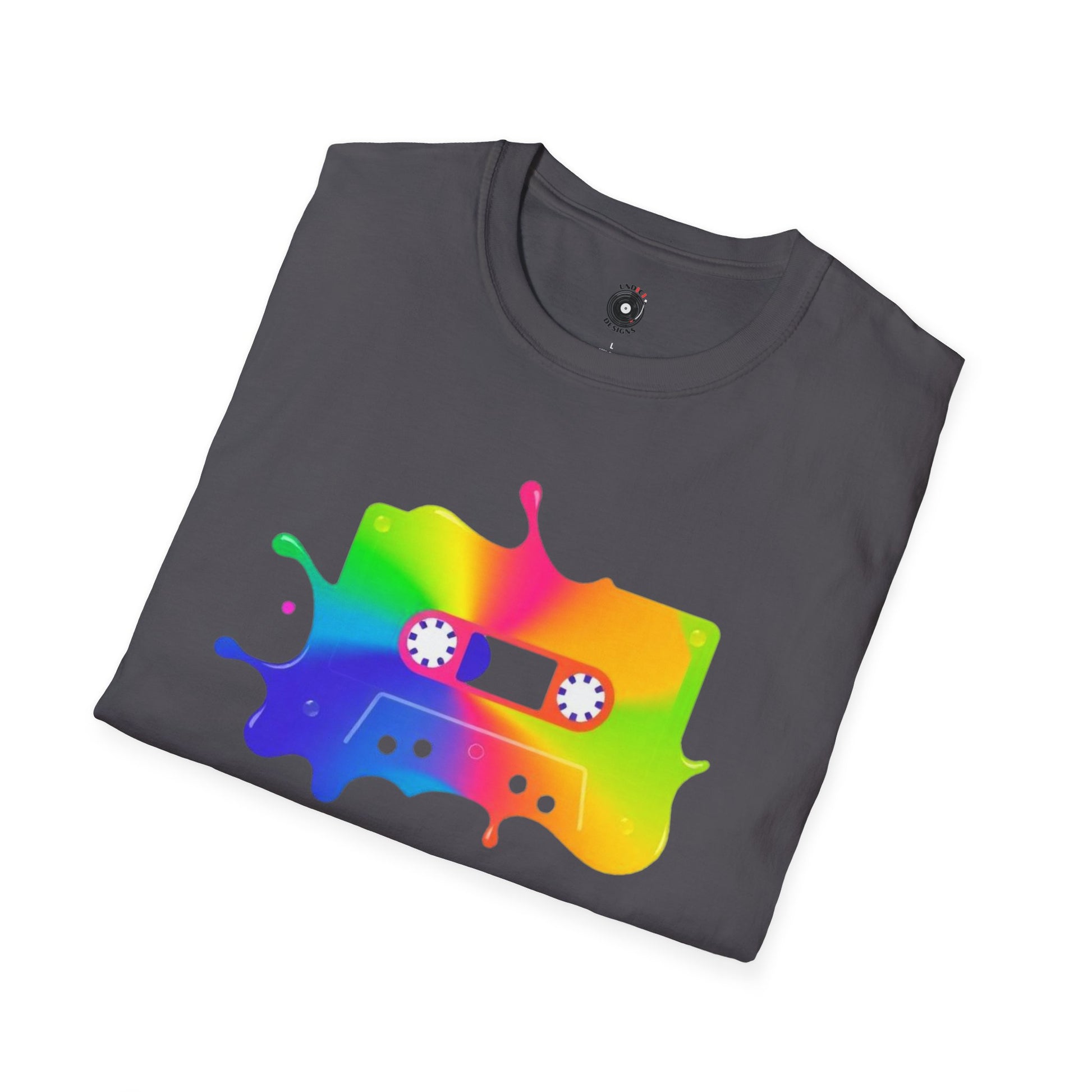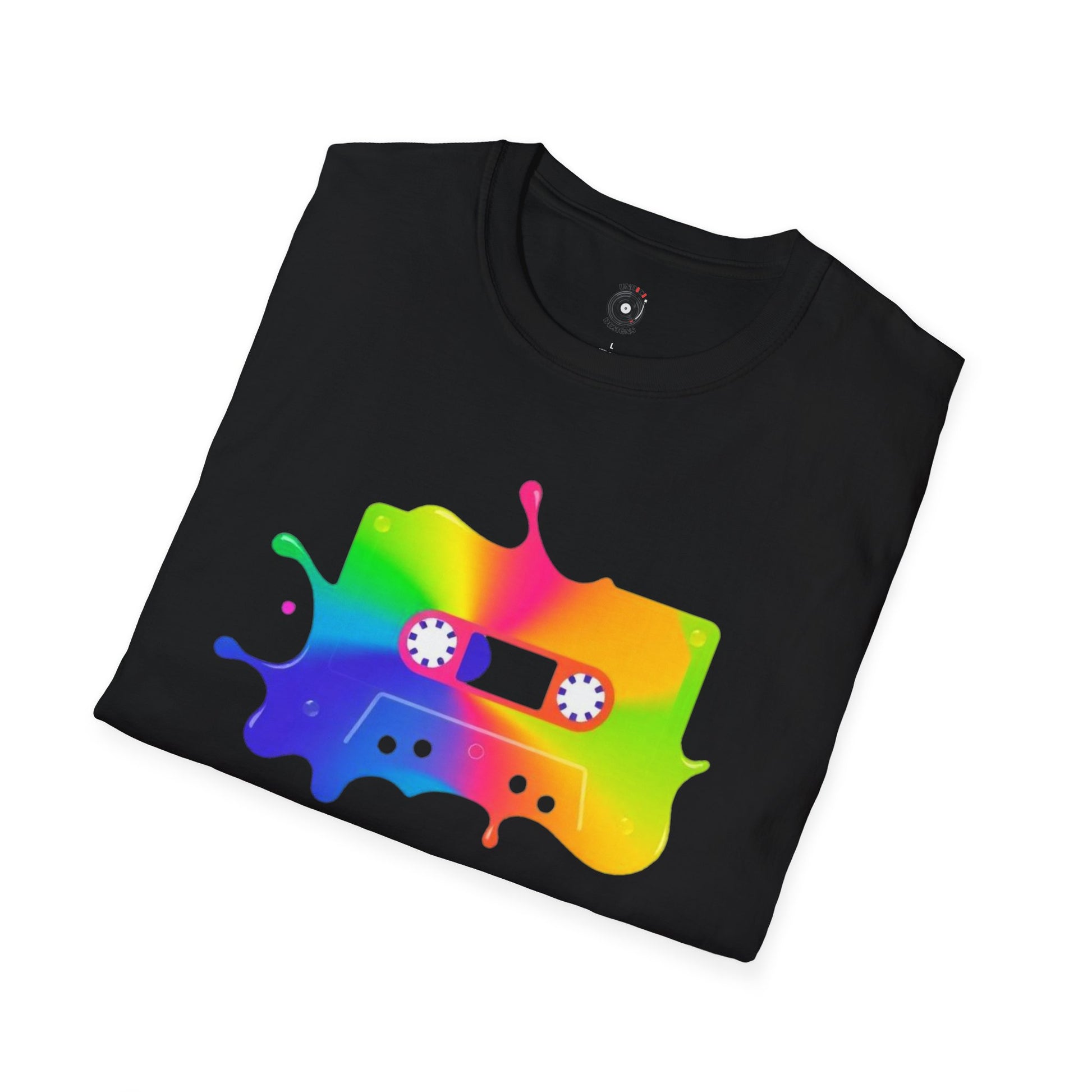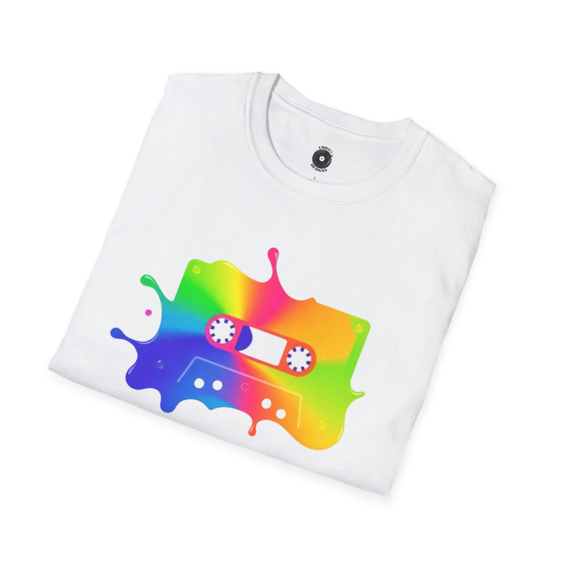 Colorful cassette tape in a splash of paint
