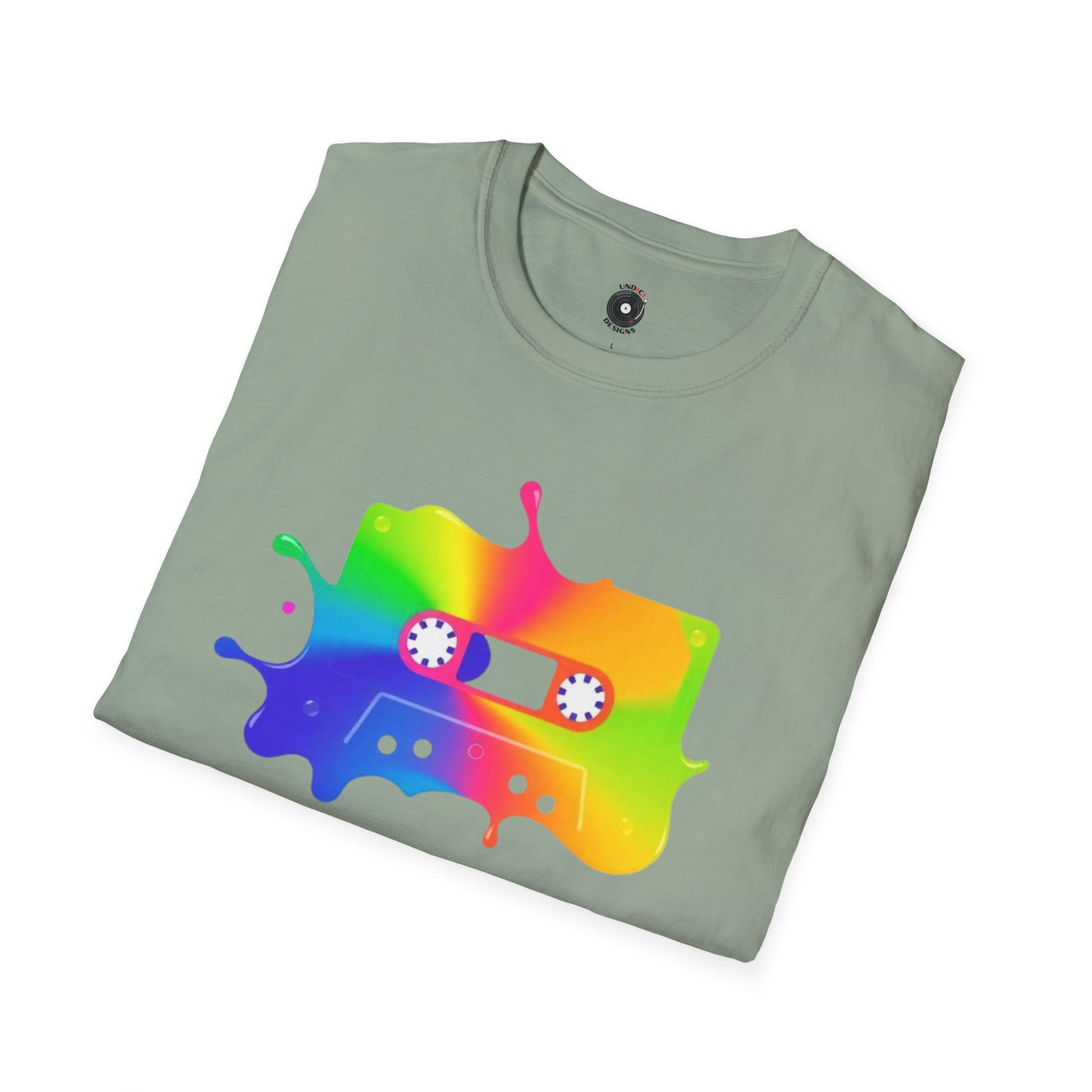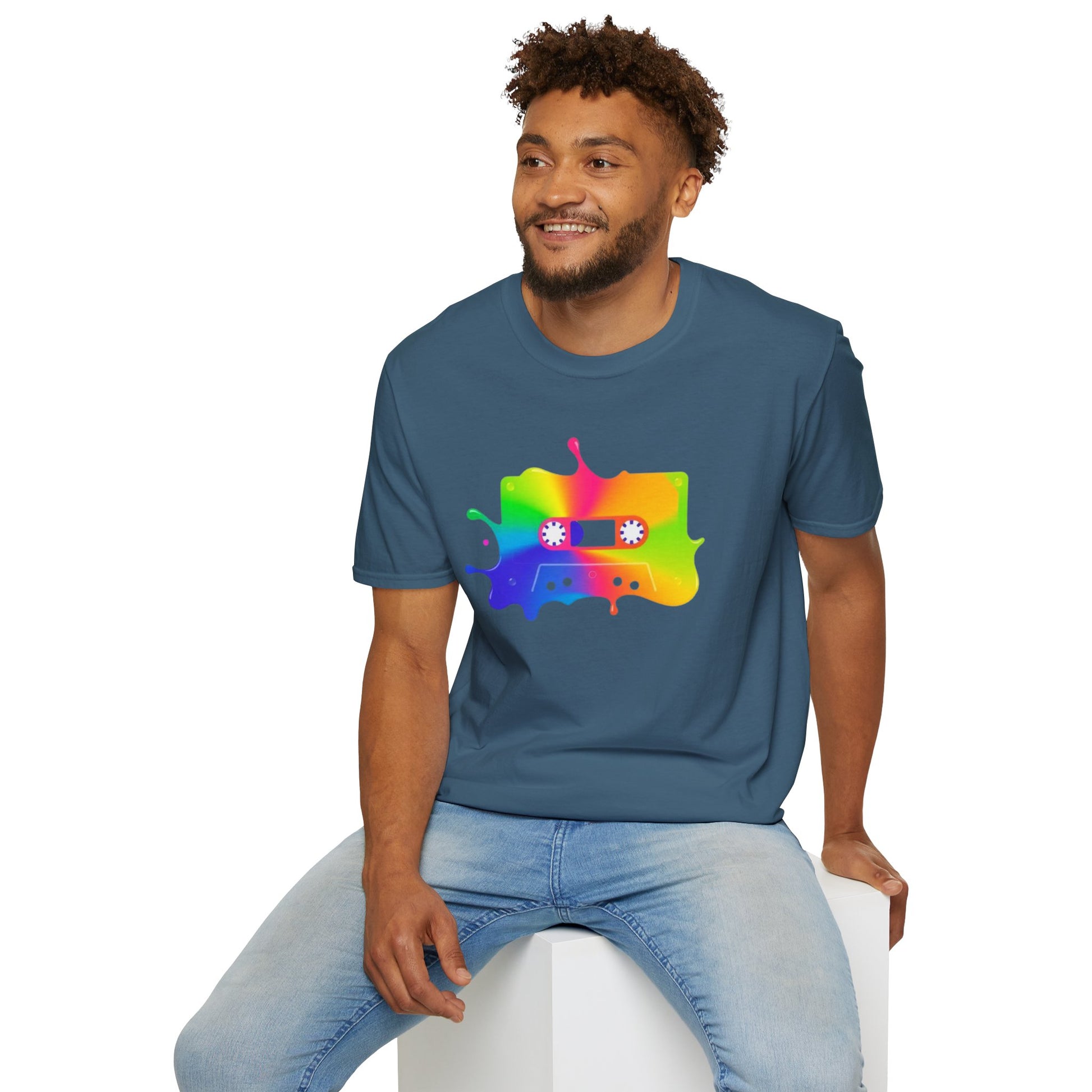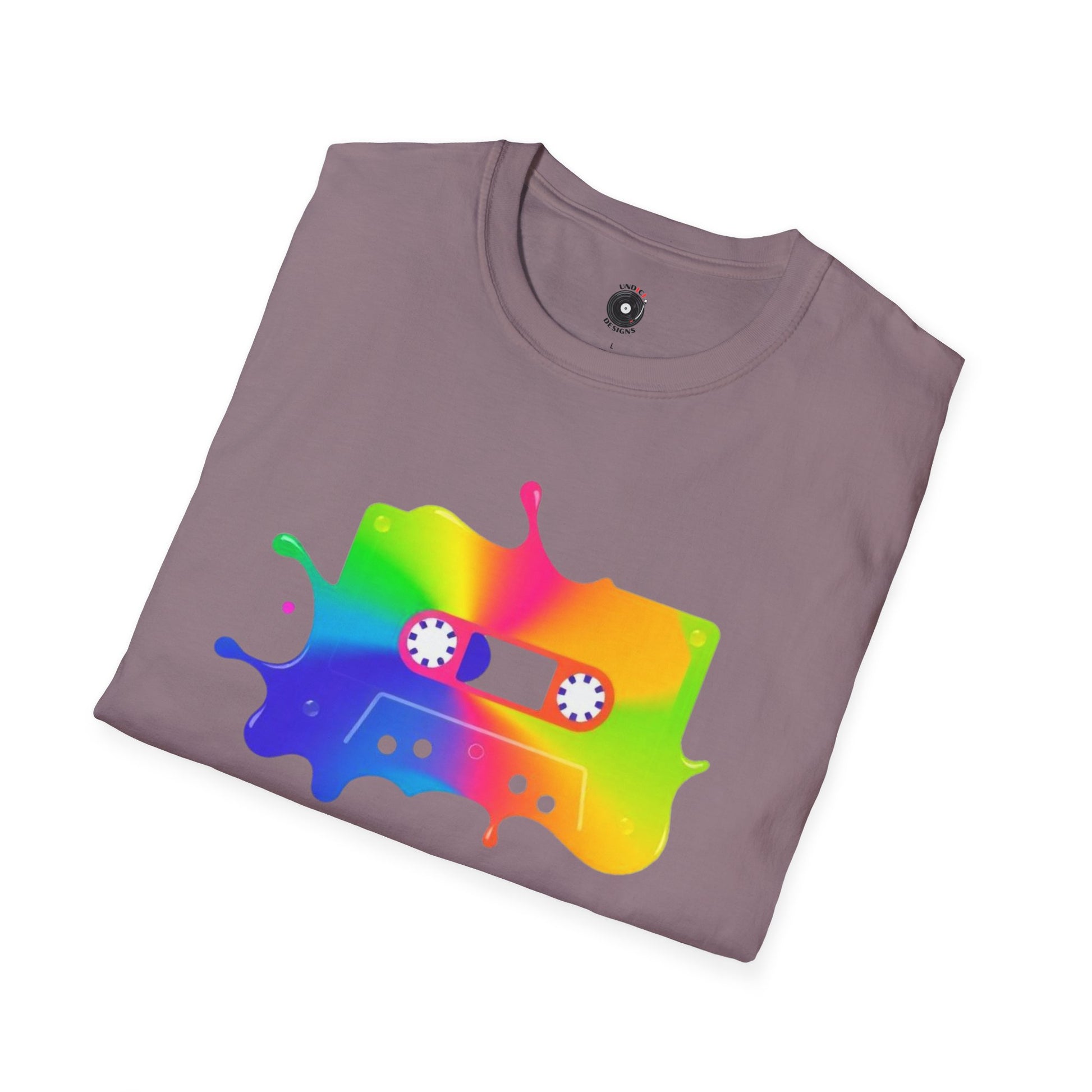 Colorful cassette tape in a splash of paint