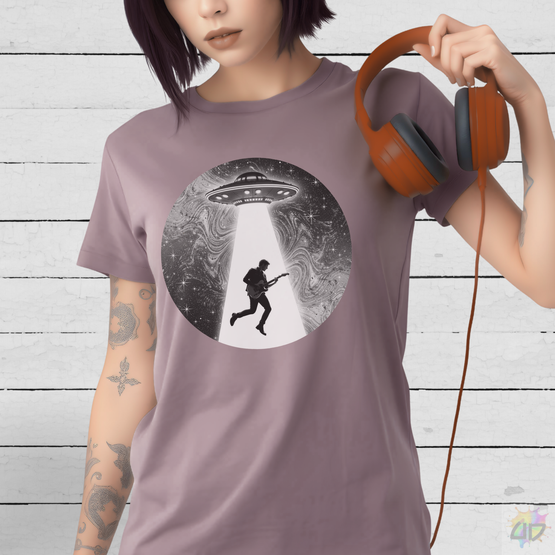 Guitarist Being Abducted in Black and White Graphic Tee.