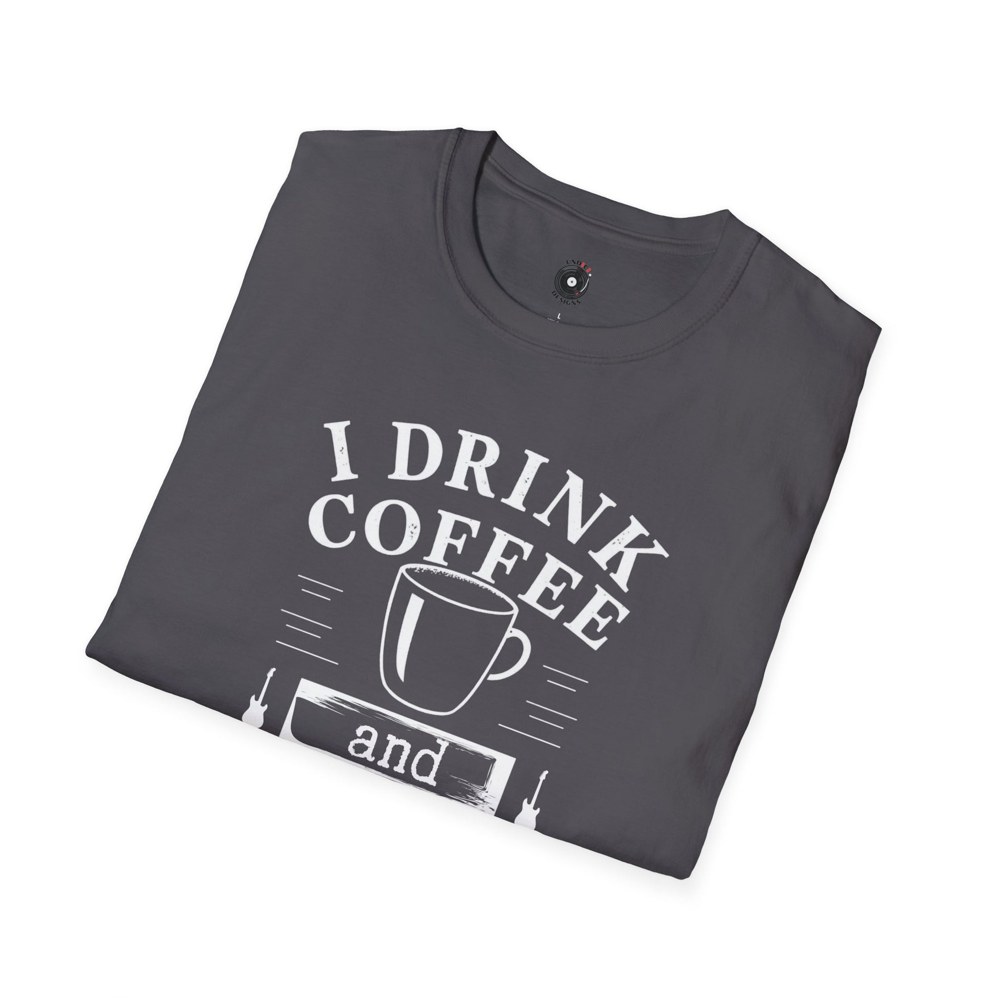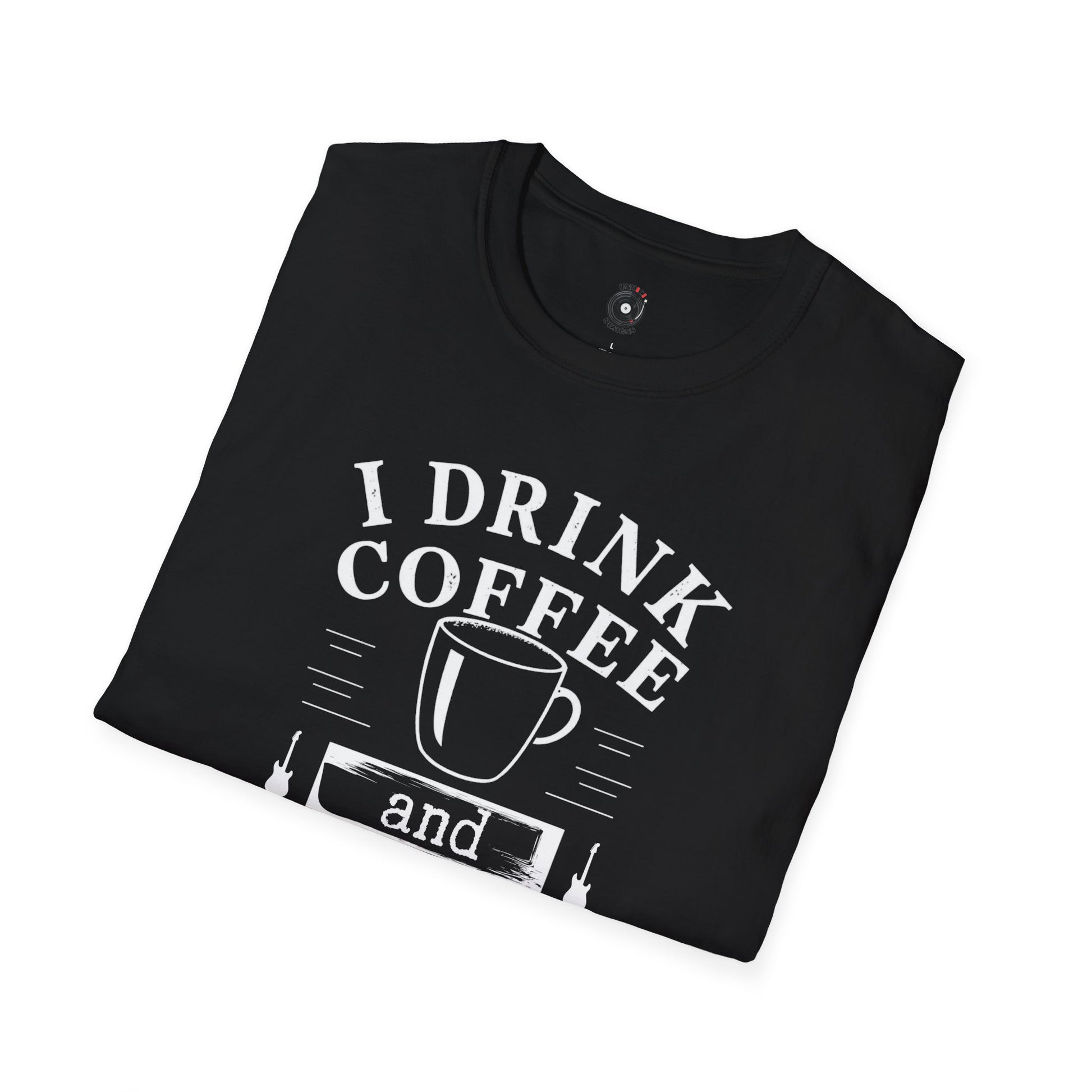 "I drink coffee and play guitar" graphic with coffee cup.